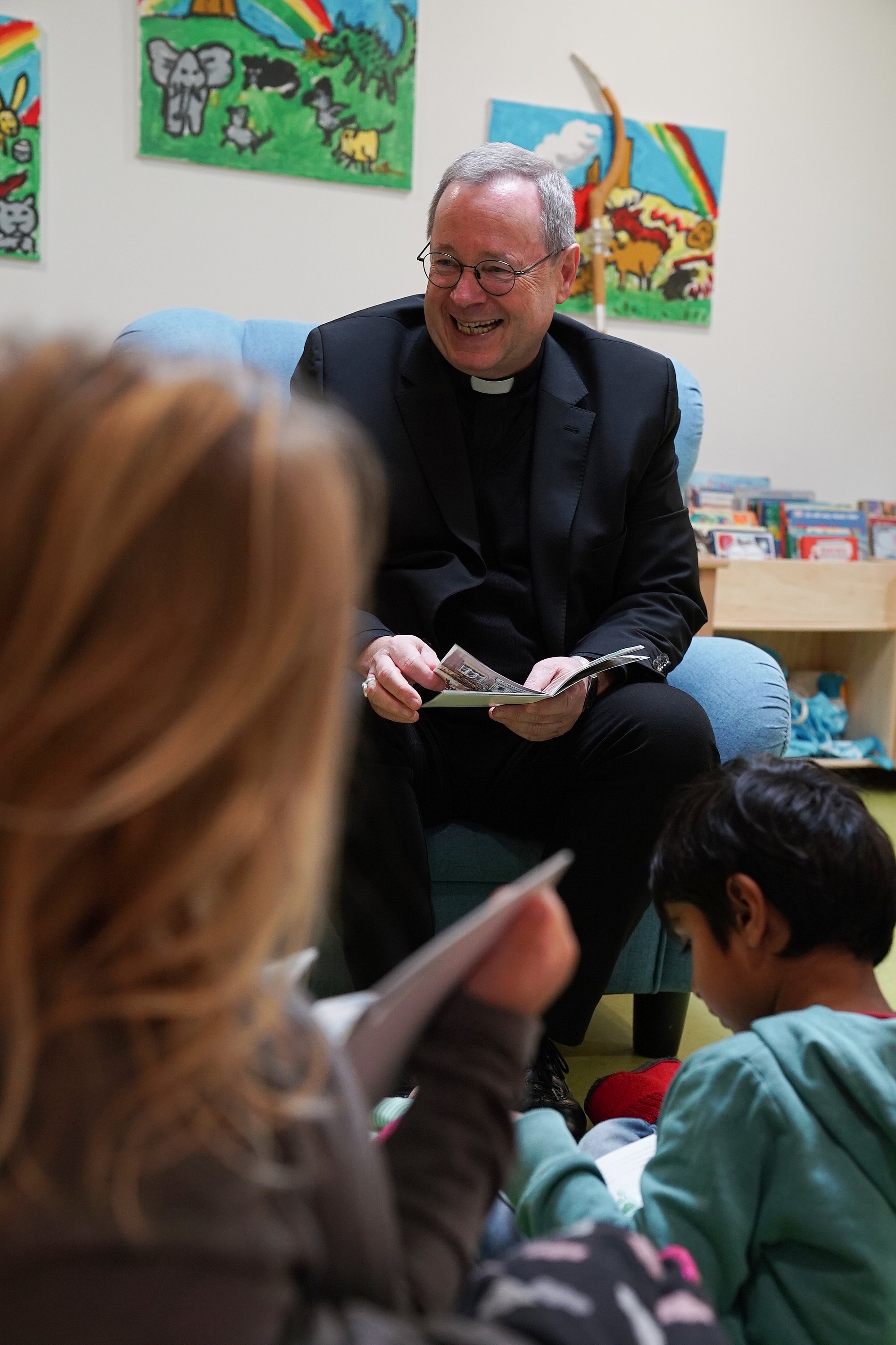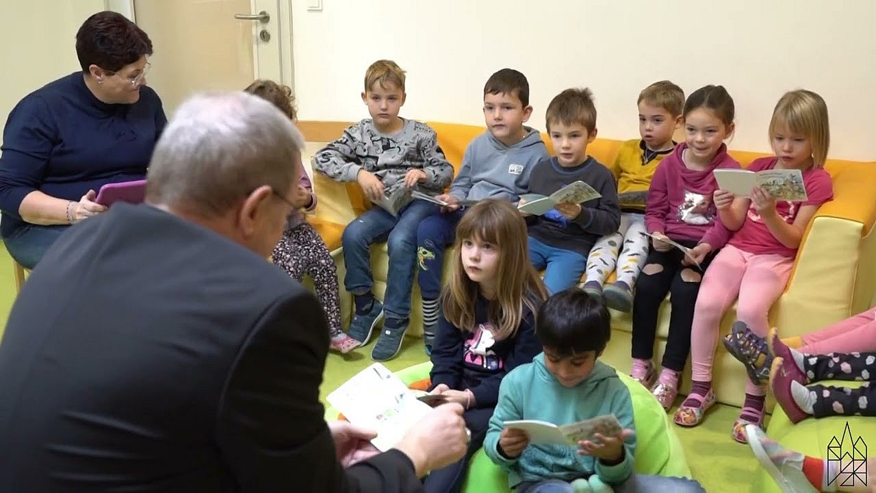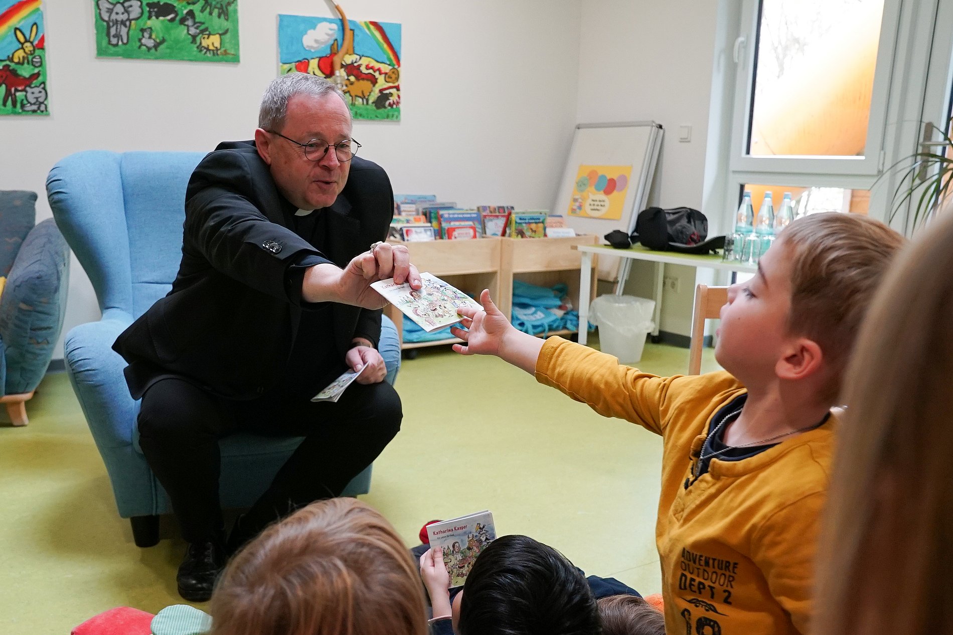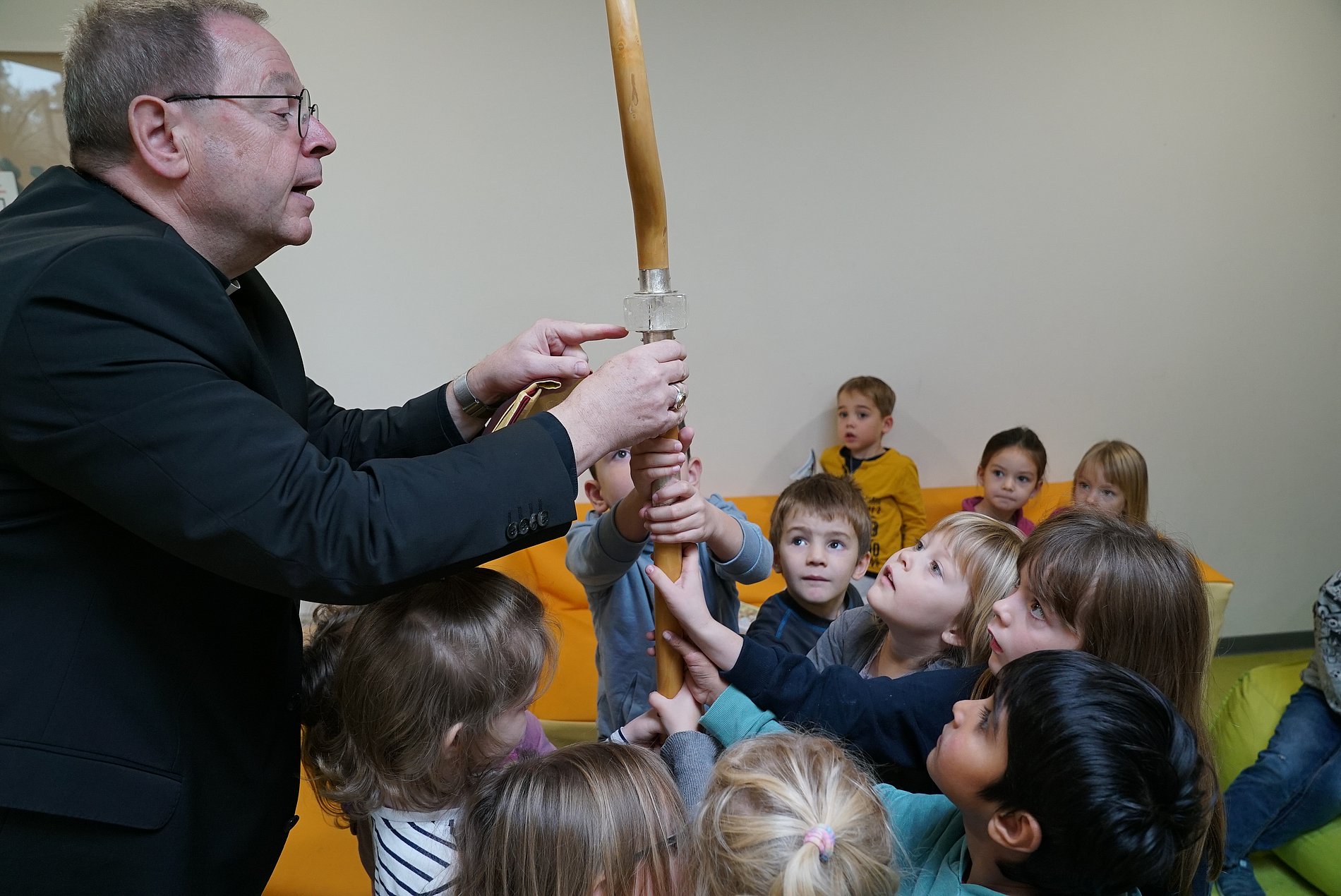Zu Beginn seines Besuchs in der Kita gab der Limburger Bischof jedem Kind die Hand und fragte nach den Namen. Er stellte sich als Bischof Georg vor und hatte noch etwas mitgebracht, das er den Kindern nach dem Vorlesen zeigte: den Bischofsstab, die Mitra und den Bischofsring. Einige Kinder durften den Stab halten und entdeckten einige Details: Zum Beispiel sahen sie einen Stein mit eingravierten Umrissen von Menschen, darunter eine Mutter und ein Vater mit Kinderwagen. Bischof Georg erklärte den Kita-Kindern die Funktion des Bischofsstabs, der einem Hirtenstab nachempfunden sei. Denn wie ein Hirte, der sich um seine Schafe kümmere, kümmere sich der Bischof um alle Gläubigen, erklärte Bätzing. Beim gemeinsamen Betrachten der Buchseite mit dem Limburger Dom, lud der Bischof die Kinder ein, ihn bald in Limburg zu besuchen.