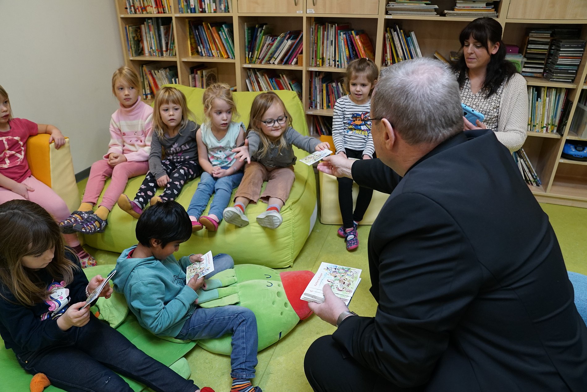 „Da sind zwei Hasen hinter dem Baum“, rief ein Mädchen und zeigte auf das kleine Buch, das jedes Kind zuvor geschenkt bekommen hatte. „Genau, da sind zwei Hasen. Und das Mädchen mit den blonden Zöpfen, das ist Katharina Kasper. Da war sie noch ein Kind, sogar noch ein bisschen jünger als ihr gerade“, bestätigte der Bischof. Die Kindergartenkinder hörten dem Bischof gespannt zu und antworteten eifrig auf seine Rückfragen, zum Beispiel, ob sie wüssten, was ein Tintenfass sei. Auf die Frage, ob ihnen die Geschichte gefallen habe, antworteten sie einstimmig: „Ja!“ Bischof Bätzing fragte die Kinder auch, ob sie noch von anderen Bischöfen gehört hätten. Den Kindern fielen der Heilige Martin und der Heilige Nikolaus ein. „Heute Morgen dachten die Kinder noch: Einen Bischof gäbe es nur im Märchen“, verriet Ulrike Spitzley, Leiterin der Kita „Unterm Regenbogen“ in Winkels. Umso erfreulicher sei es, dass Bischof Bätzing als Vorlesepate in die Kita komme und alle Gruppen besuche, so die Kita-Leiterin.