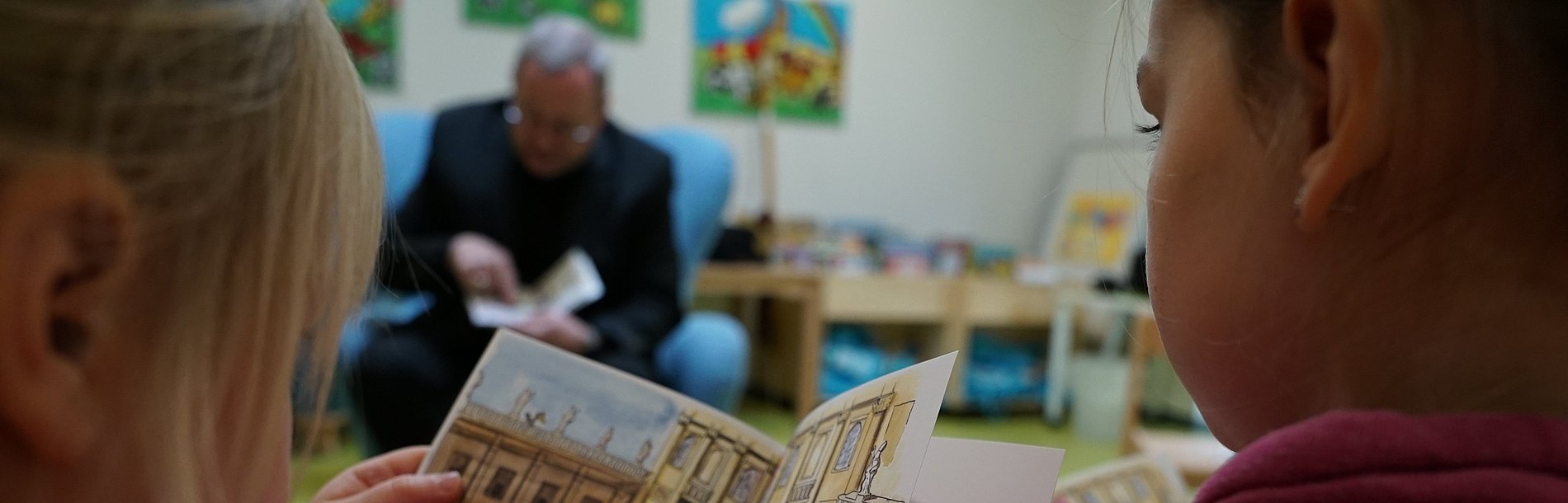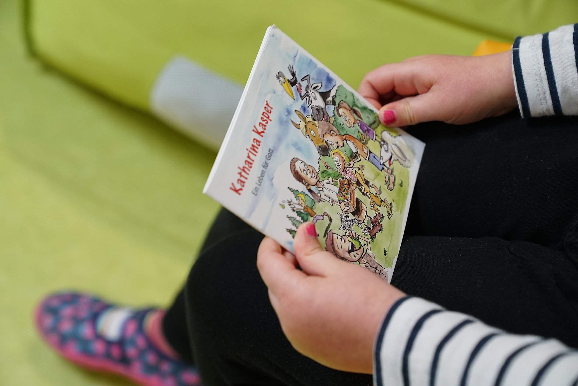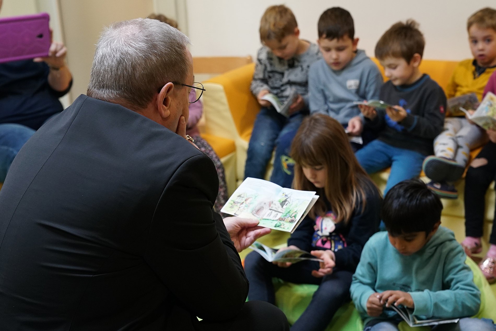 Bischof Dr. Georg Bätzing hat am bundesweiten Vorlesetag am Freitag, 17. November 2023, den Kindern aus der Katholischen Kita „Unterm Regenbogen" in Winkels ein Kinderbuch über Katharina Kasper vorgelesen. Die 14 Kinder im Leseraum entdeckten gemeinsam mit dem Limburger Bischof viele Details auf den Bildern im Buch „Katharina Kasper. Ein Leben für Gott“: Delfine, die das Schiff von Katharina Kasper nach Amerika ziehen oder einen weinenden Raben, als über den Tod von Katharina berichtet wird.