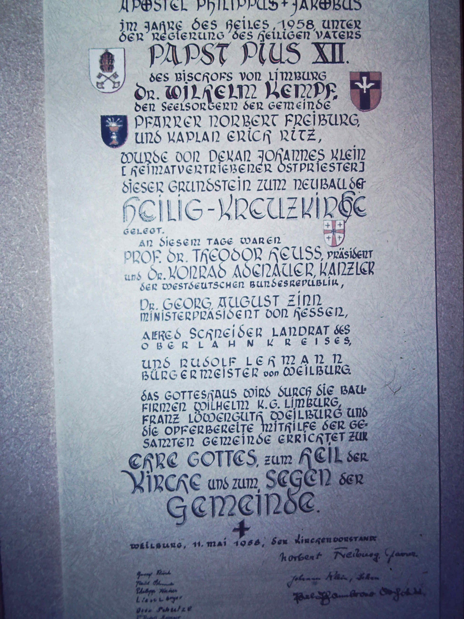 Pfr. Freiburg legte großen Wert darauf, dass möglichst viele einheimische Firmen berücksichtigt wurden. An Sonntagen, so berichtet die Chronik, pilgerte halb Weilburg zu dem Gelände, um zu sehen, welche Fortschritte erzielt wurden. Willi Kahl, Pfarrer der evangelischen Gemeinde, ließ Freiburg wissen, dass er aufrichtige Freude darüber empfinde, "dass die katholische Pfarrgemeinde nun bald einen würdigen Rahmen für ihr gottesdienstliches Leben haben wird."