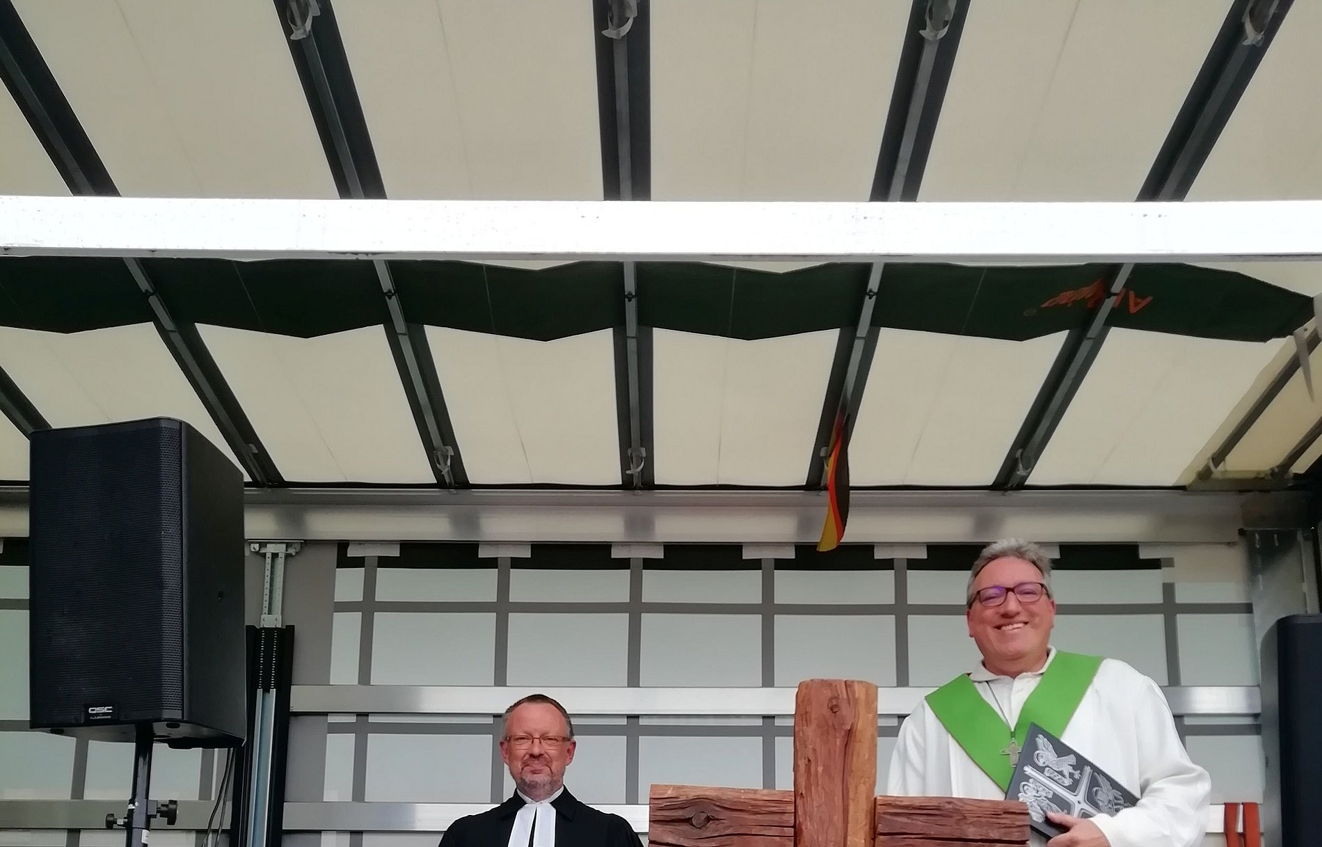 Ein Highlight war am Sonntag Nachmittag der ökumenische Gottesdienst mit anschließender LKW Segnung. Pfarrer Hans-Joachim Schäl (Merenberg) und Gemeindereferent Hilmar Dutine hatten dazu auf einem LKW Anhänger einen provisorischen Altarraum mit großem Holzkreuz, Kerzen und Weihwasser aufgebaut.