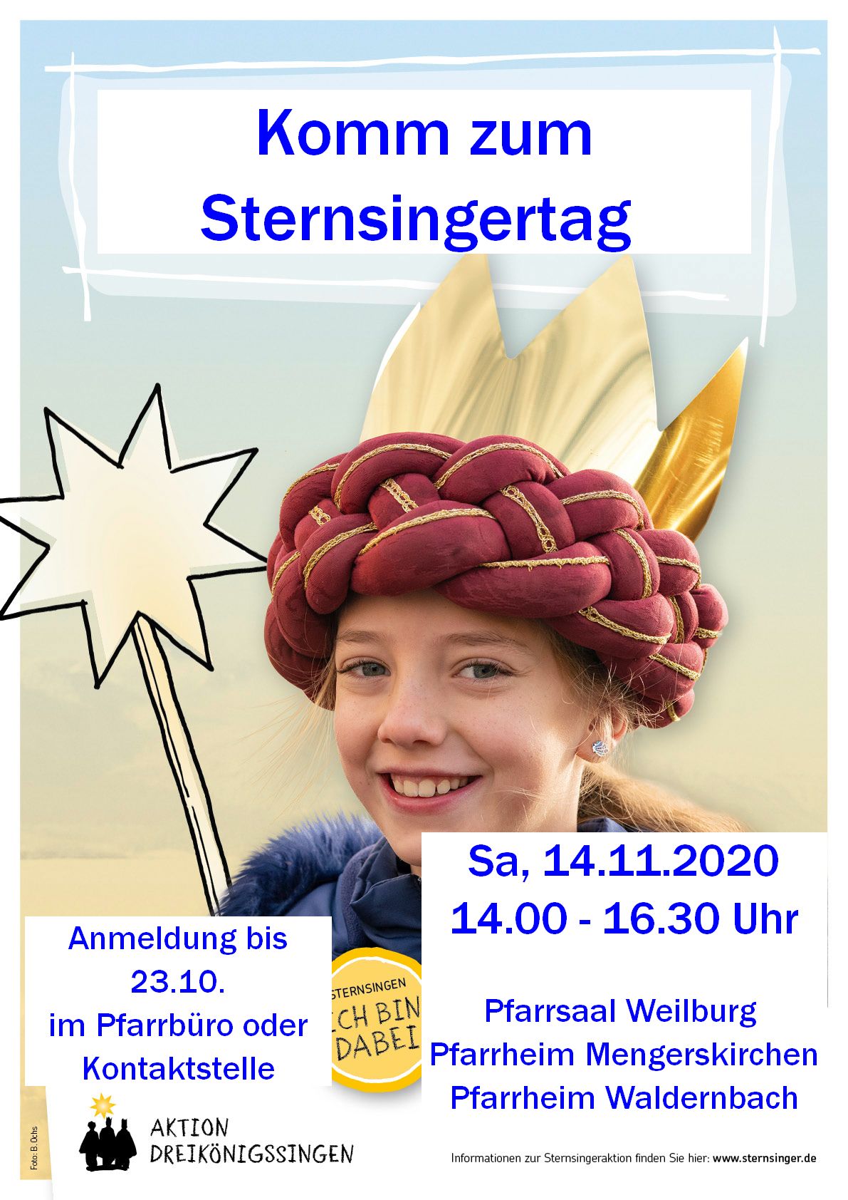 Hast Du Lust zum Mitmachen? Dann melde Dich bitte bis spätestens 23. Oktober mit der Anmeldung (unten im Download) an. Du kannst ihn per Mail an h.dutine@heiligkreuz-oberlahn.de schicken, im Pfarrbüro Weilburg (Frankfurter Str. 8) oder einer der Kontaktstellen Mengerskirchen, Waldernbach, Winkels oder Dillhausen abgeben.