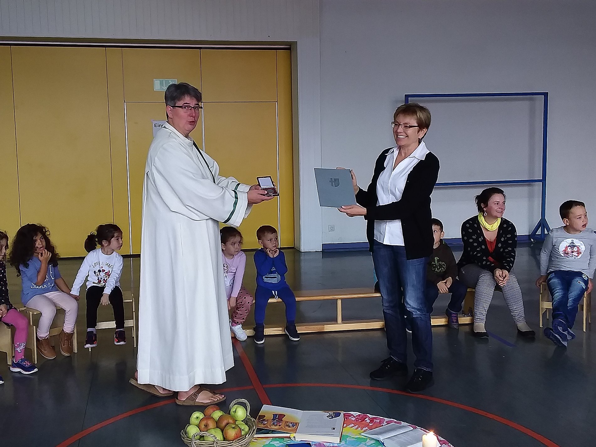 „Wir feiern zwar heute Erntedank, aber es gibt noch einen Grund, jemandem danke zu sagen!“…mit diesen Worten eröffnete Gemeindereferentin Britta Höhler während des Erntedankgottesdienstes der KiTa „Unterm Regenbogen“ in Winkels ihren Dank und die Gratulation zum 25jährigen Dienstjubiläum von Anna Gath.