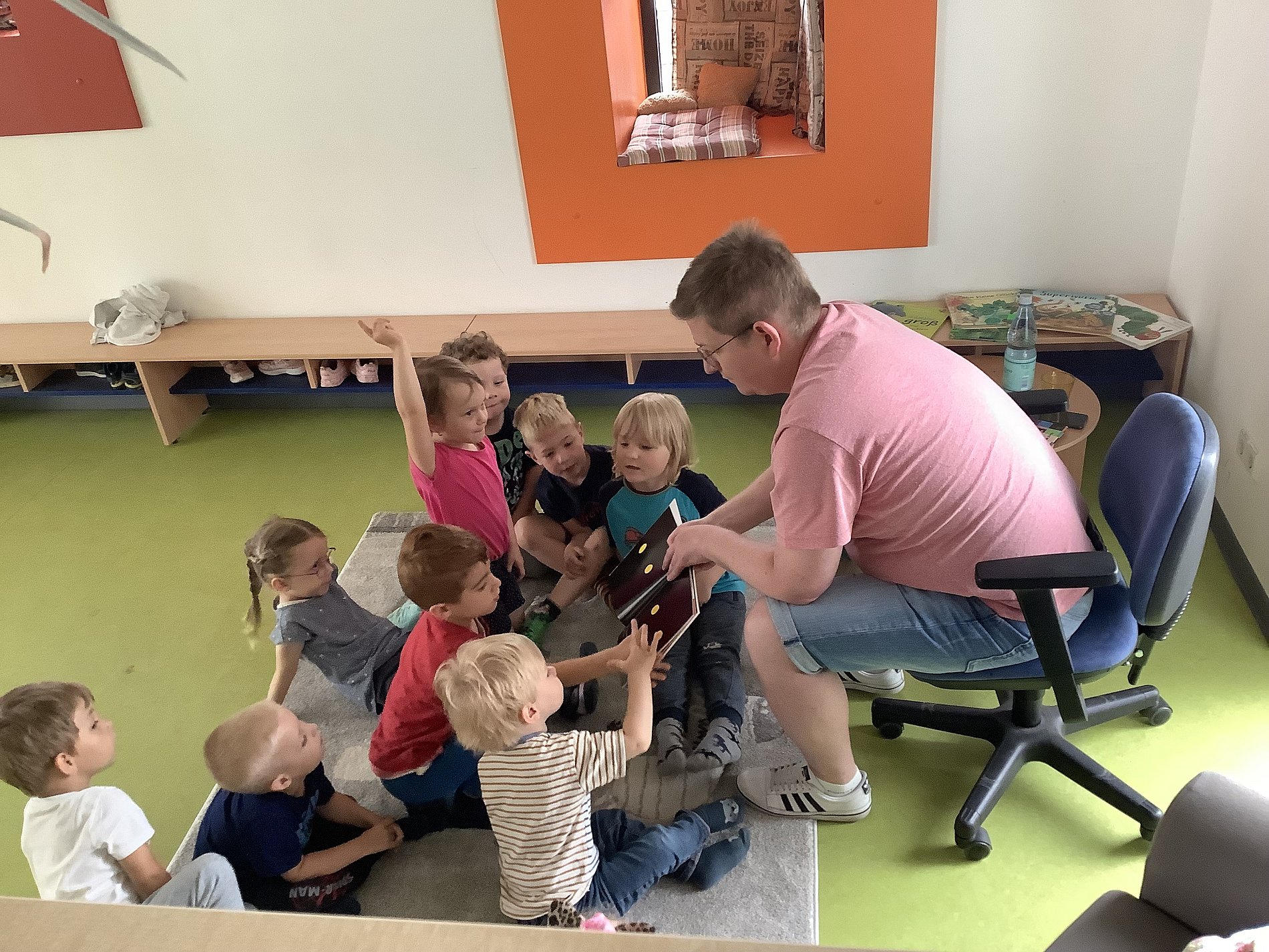 Anfang Juli kam Pfarrer Frank Fieseler als erster in die "Kita St. Maria Magdalena" und gabt den Start für unsere Vorlesepaten. Mit Kindern verschiedener Altersgruppen nahm er sich die Zeit und las ihnen vor. Um Kindern die Welt der Bücher zu eröffnen, brachte er als Geschenk das „Mitmach Buch“ mit. Alle Kinder waren begeistert davon.