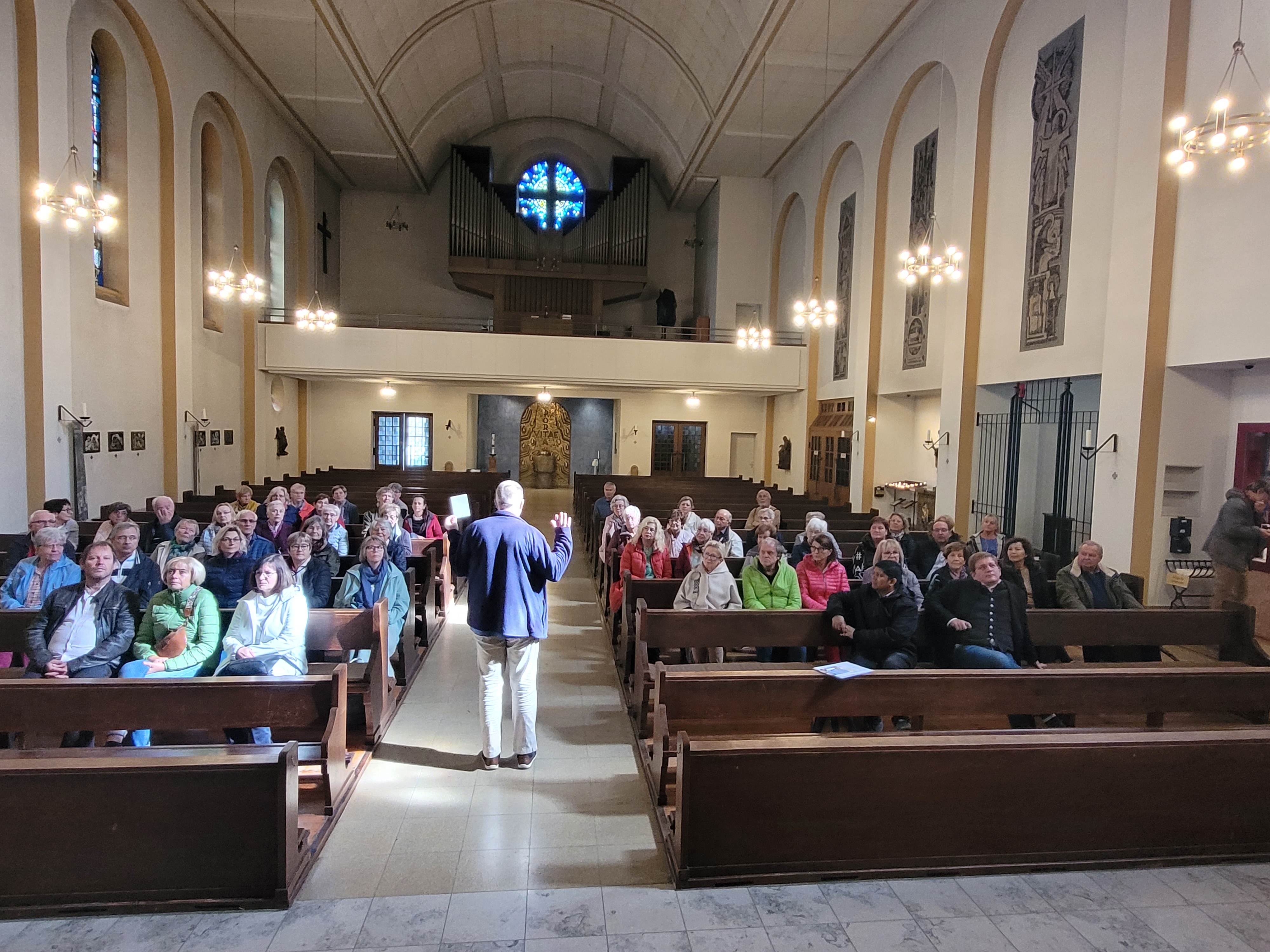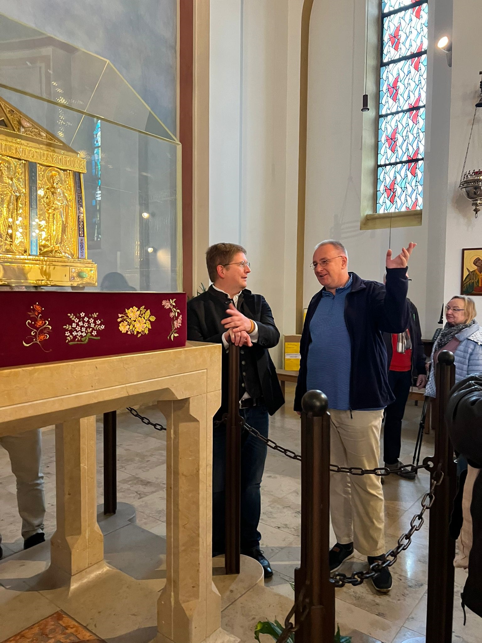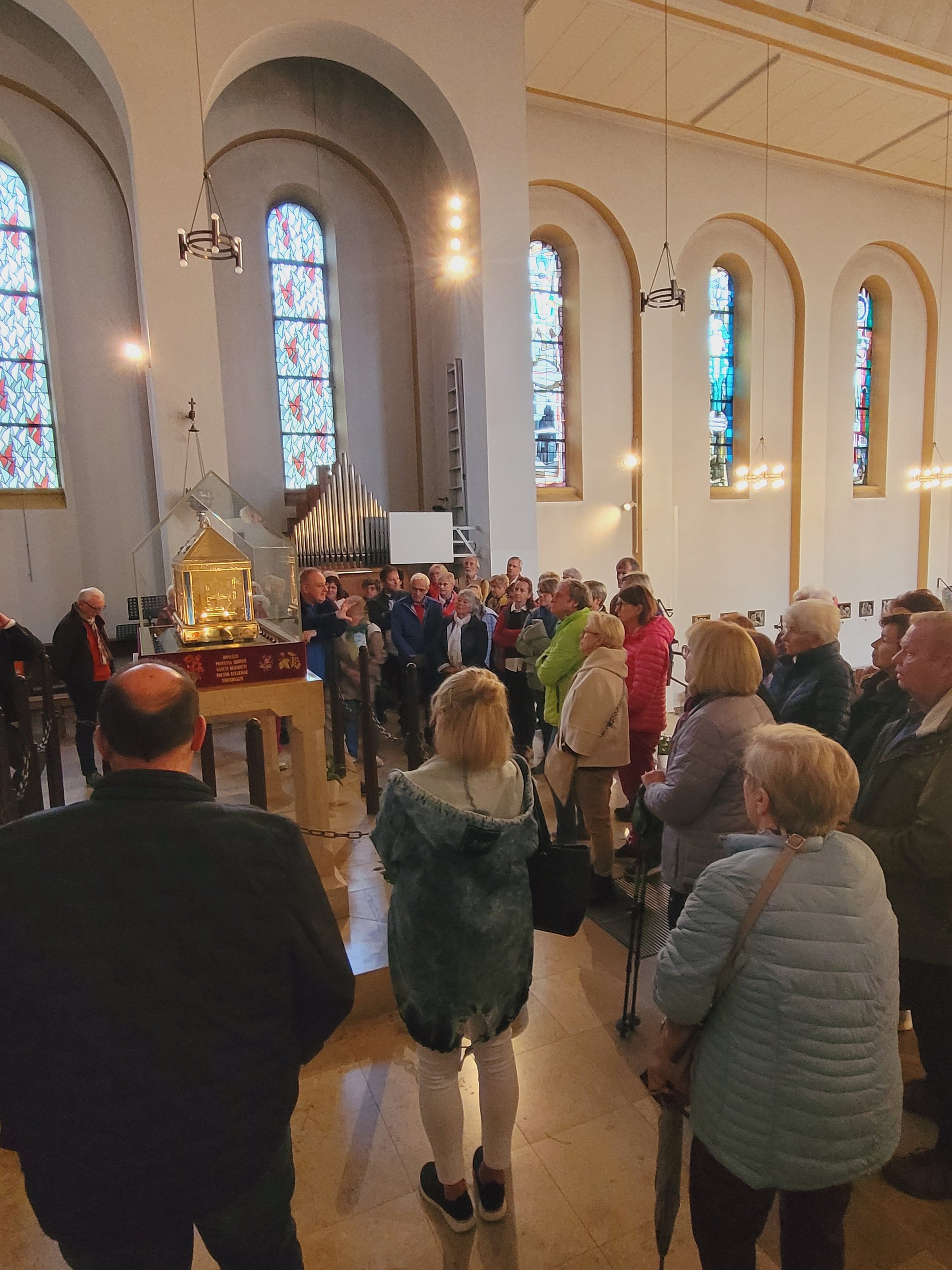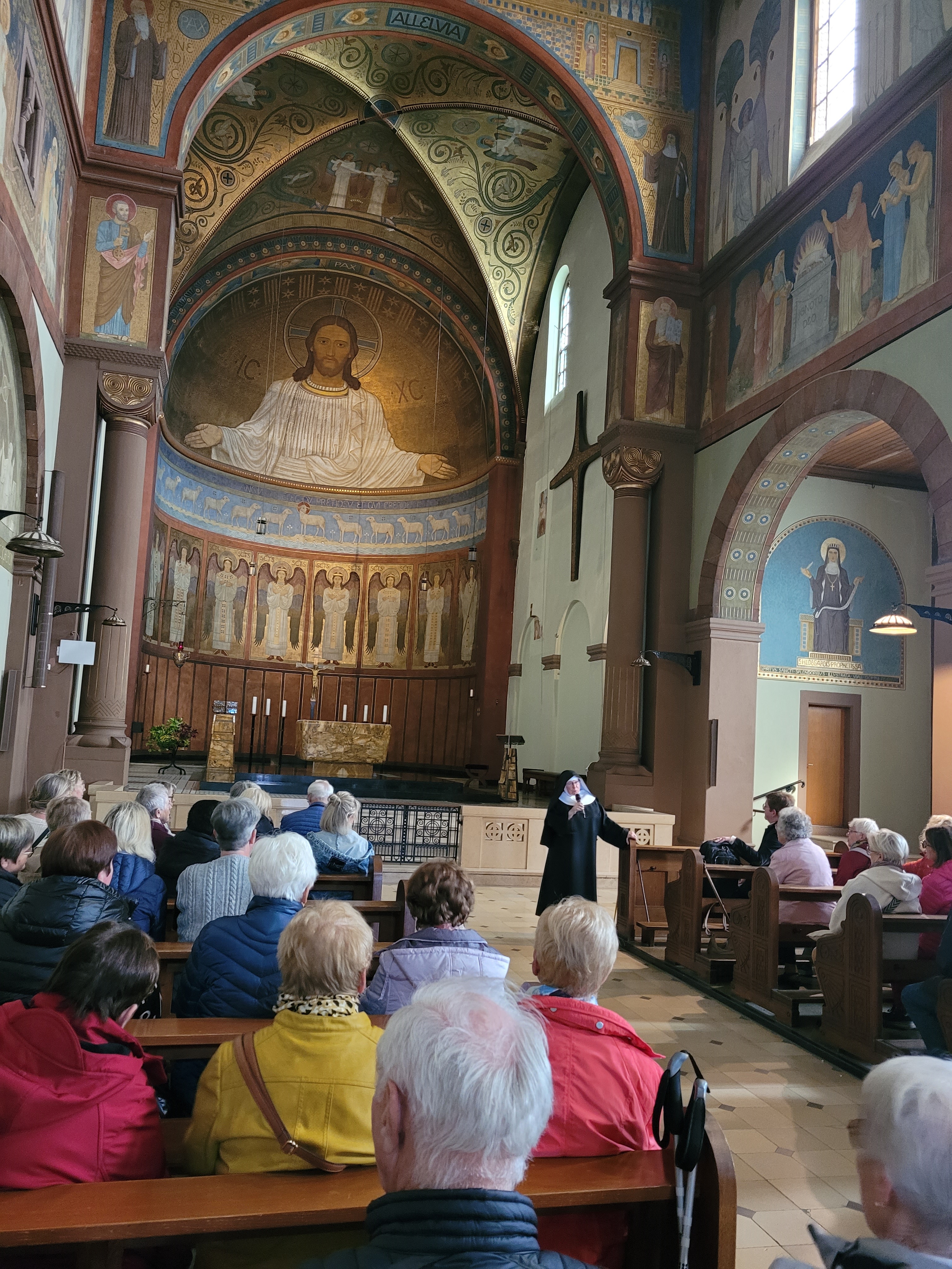 Schon im Bus wurde gebetet und gesungen, bevor alle in der Wallfahrtskirche im Ort Eibingen, dem Standort des ehem. Klosters eine Messe feierten. In dieser Kirche steht auch der Schrein mit den Reliquien der Heiligen. Nach der Messe führte Wallfahrtsseelsorger Sebastian Braun ins Leben und Wirken der Heiligen Hildegard ein.